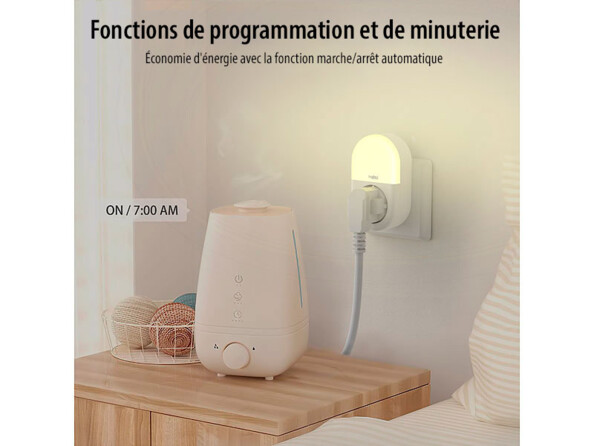 - Fonction Minuteur : activation/désactivation automatique aux horaires définis individuellement pour la prise et la veilleuse
