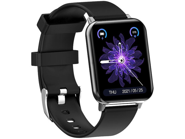 - Smartwatch PW-500.app avec bracelet en silicone, câble USB magnétique et mode d'emploi en français