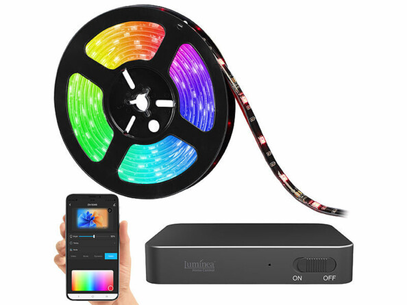 La bande LED IC RVB Luminea Home Control s’allume en fonction de l’image télévision sans délai.