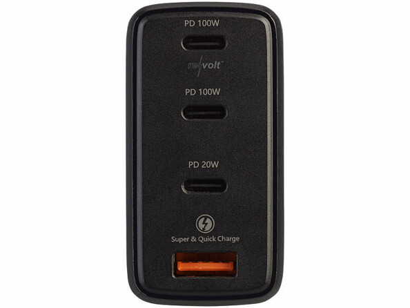 - Adaptateur secteur GaN 120 W à 4 ports USB-C / USB-A coloris noir de la marque Revolt