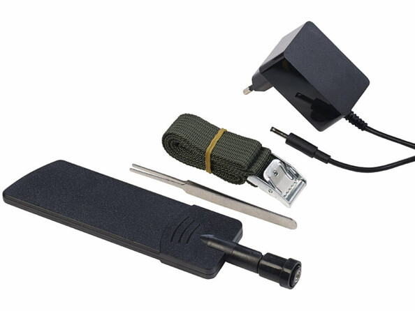 - Caméra de chasse WK-650.lte avec batterie, câble de chargement USB (USB-A vers USB-C), sangle de maintien, pincette et mode d’emploi en français