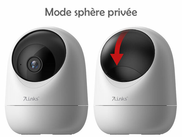 - Mode Sphère privée : objectif occulté pour pauses de surveillance à des heures définies ou manuellement via l'application