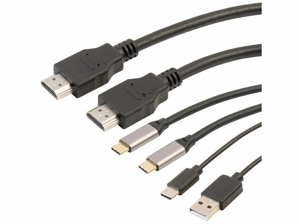 - Moniteur EZM-220, câble HDMI (HDMI vers HDMI, 1,5 m), câble d'alimentation USB (USB-A vers USB-C, 1 m), câble USB-C (USB-C vers USB-C, 1 m), housse de protection, mode d'emploi en français
