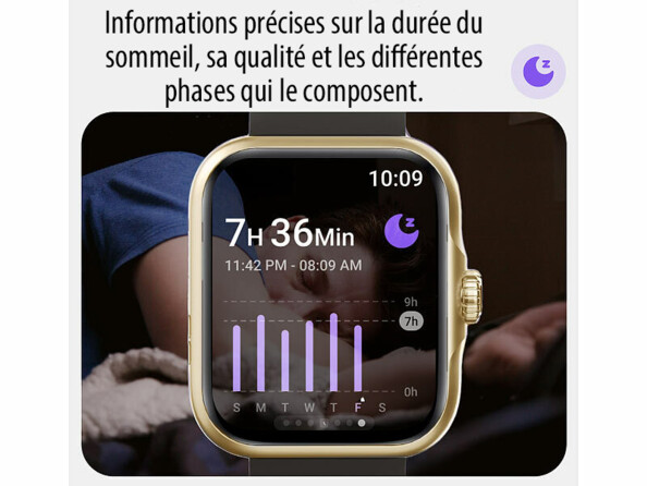 - Fonctions fitness : podomètre, durée d'activité, compteur de calories, analyse du sommeil et distance parcourue