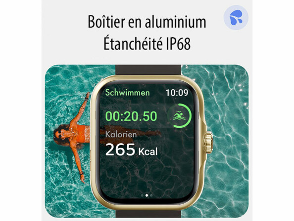 - Fonctions en plus : affichage de la météo, réveil, chronomètre, minuteur, respiration assistée, lecture audio, etc.