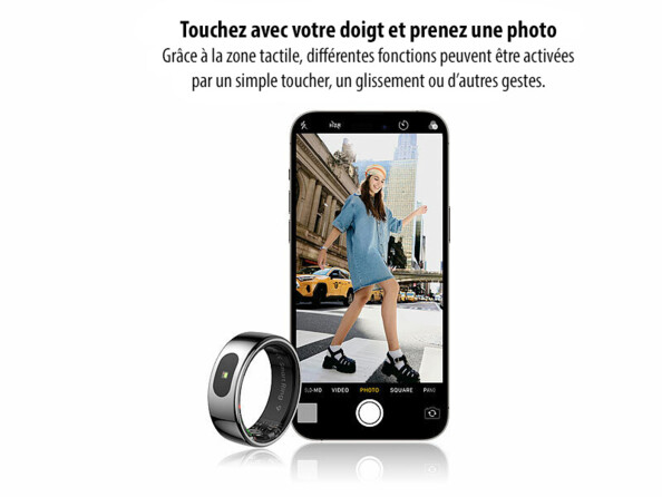 Il suffit d'effleurer la bague du doigt pour déclencher l'appareil photo de votre smartphone sans avoir à tenir votre appareil mobile dans la main. Vous pouvez également contrôler la lecture de musique et de vidéos ou feuilleter votre livre électronique. Si vous n'avez pas besoin de la fonction tactile, il vous suffit de la désactiver.