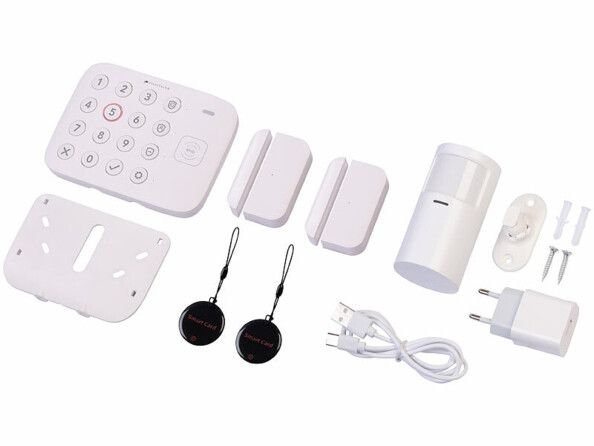 - Système d'alarme en kit avec capteur de mouvement PIR, 2 capteurs pour porte/fenêtre, 2 clés RFID, matériel de montage et mode d’emploi en français