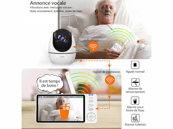 - 4 boutons d'aide : aide générale, changement de position allongée, toilettes, soif