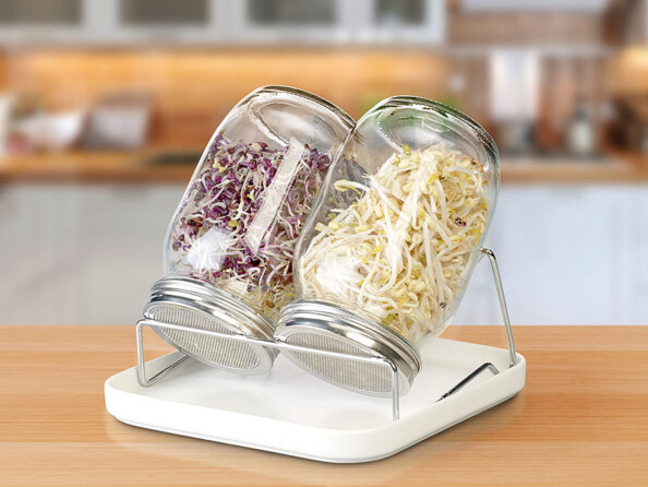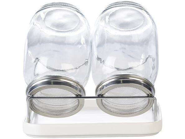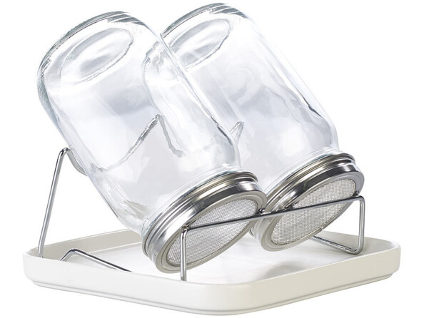 Pendant la germination, les germes doivent être régulièrement rincés à l'eau. Le tamis en acier inoxydable à mailles fines situé dans le couvercle empêche les graines de tomber des bocaux pendant le rinçage. Pour que l'eau restante puisse s'écouler à tout moment et éviter la formation d'eau stagnante, le support métallique assure un angle d'inclinaison optimal et une bonne circulation de l'air. Le bol en céramique s'adapte parfaitement sous le support et recueille l'eau qui s'écoule. Ainsi, l’eau ne stagne pas et vous évitez la formation de moisissures.