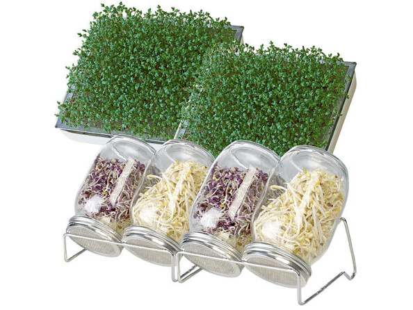 - Pack de 4 bocaux de germination avec tamis à cresson, support en métal, bac de récupération en céramique et mode d’emploi en français