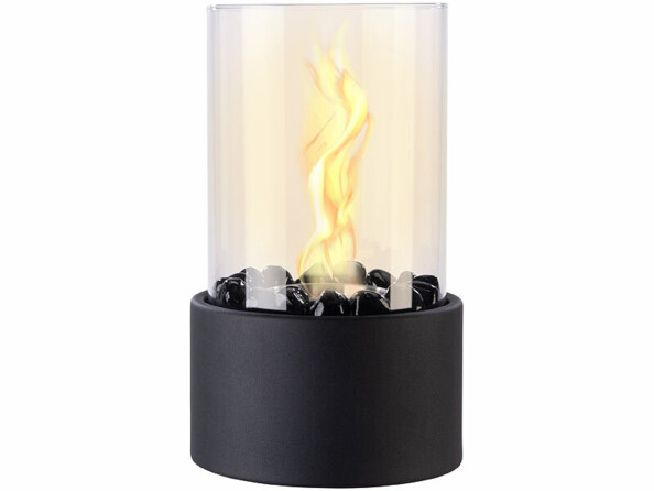 - Cheminée de table au bioéthanol avec pierres décoratives, base en métal et cylindre en verre