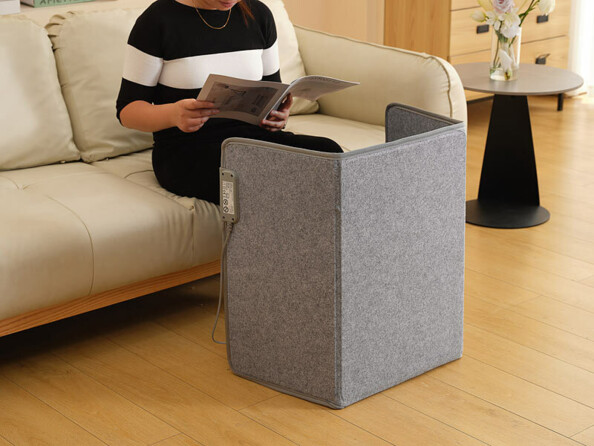 Grâce à un triptyque de panneaux verticaux, il maintient vos jambes au chaud lorsque vous travaillez sur votre ordinateur, assis devant votre bureau ou sur votre canapé. Pour cela, il émet des rayons infrarouges capables de chauffer jusqu’à 65°C selon le degré de température choisi parmi les trois niveaux de chauffe disponibles. Mais ce n’est pas tout ! Il intègre également un tapis pour vous réchauffer les pieds ! Merveilleux, n’est-ce pas ?