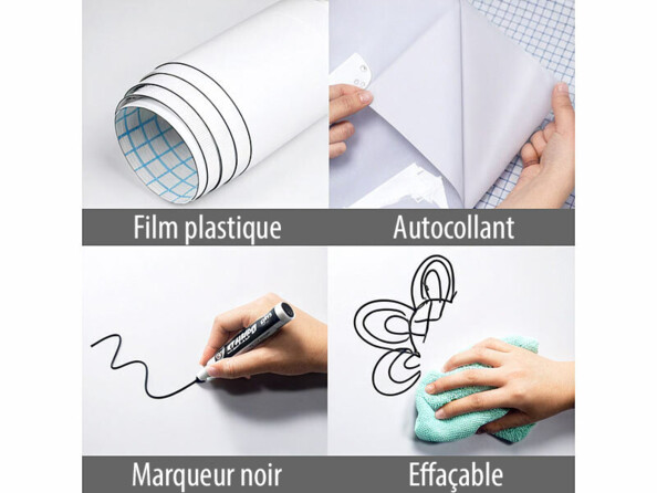 N'oubliez plus rien grâce à ce tableau blanc autoadhésif 45 x 200 cm pour feutres ! Ce dernier se colle simplement au mur, sans clou ni trou. Avec sa vaste surface de 45 x 200 cm, le tableau accueille vos idées, vos dessins, vos schémas, etc. Utilisez-le comme pense-bête ou offrez-le à votre enfant pour des heures de jeu ! Le tableau est fourni avec un marqueur noir et un effaceur, de façon à ce que vous puissiez l'utiliser immédiatement ; mais si vous préférez écrire en couleur, sachez que le tableau est compatible avec n'importe quel autre marqueur à eau. Comme tout tableau ou ardoise à feutre, vous pouvez effacer ce film d'un revers de main ; réutilisez-le ainsi à loisir !