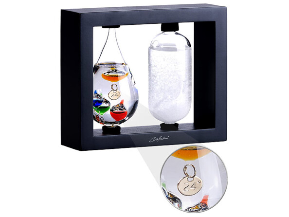 Cet objet de décoration élégant se compose d'un cadre en bois intégrant un thermomètre de Galilée et un baromètre de Fitzroy.