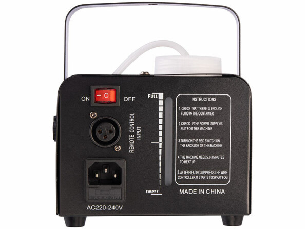 - Machine à fumée, câble d'alimentation, interrupteur filaire, télécommande avec pile, support, matériel de montage, mode d'emploi en français