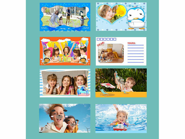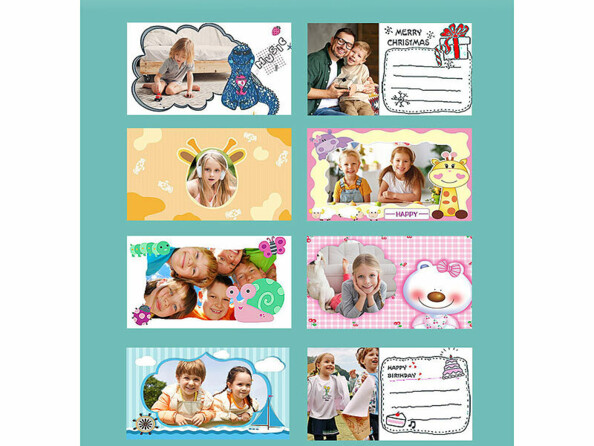 - 17 cadres photo à sélectionner par pression sur un bouton : motifs en rose et bleu, avec Père Noël, girafe, ourson, abeilles, pingouin, etc.