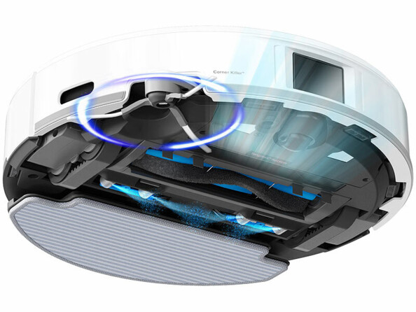Grâce à sa longue brosse d'angle, le robot atteint également la poussière et la saleté le long des murs et dans les coins. Ainsi, rien ne lui échappe et vous n'avez plus besoin de repasser derrière lui.