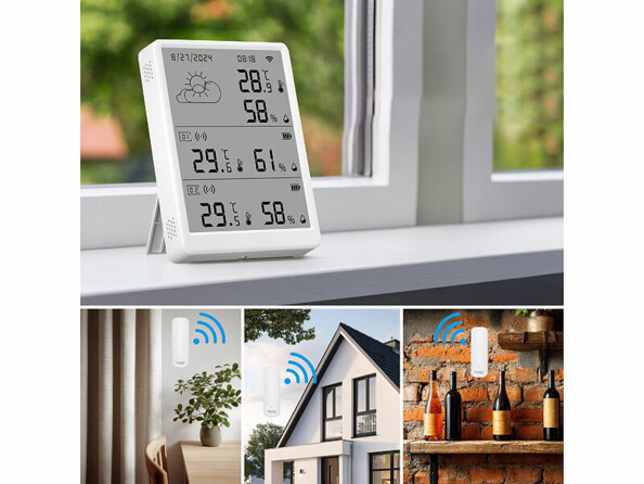 - Écran et 3 capteurs externes pour température et humidité : pour lire les valeurs mesurées à partir de 4 emplacements différents, de manière centralisée