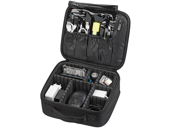 Le sac de rangement dispose d'espaces spécialement dédiés aux cartes mémoire et aux câbles. En effet, la partie supérieure du sac comporte quatre longs compartiments adaptés aux objets particulièrement fins. De cette manière, vos câbles sont protégés contre la formation de nœuds et vos cartes SD sont à portée de main. Vous êtes ainsi parfaitement équipés pour votre prochaine réunion d'affaires !