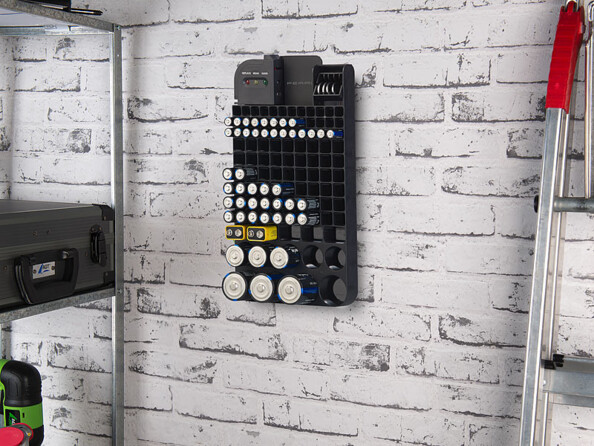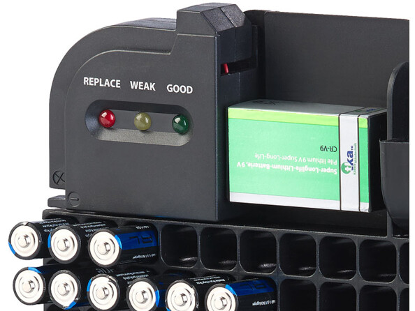 - Emplacements pour 110 piles : 54 x AA, 36 x AAA, 5 x 9 V, 5 x C, 4 x D et compartiment supplémentaire pour jusqu'à 6 piles bouton