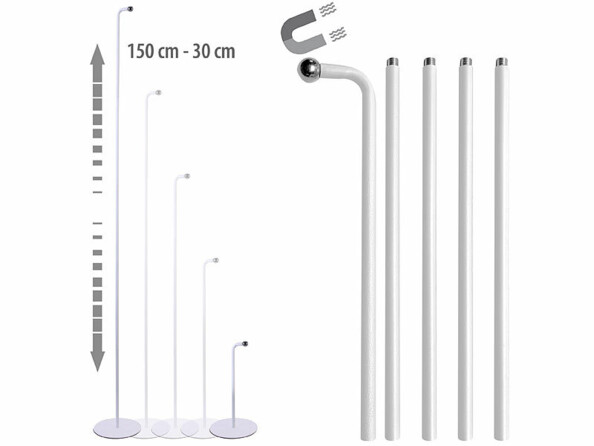 Grâce aux cinq tiges amovibles de 30 cm chacune, vous pouvez ajuster la longueur du pied selon vos besoins, et l'étendre jusqu'à 150 cm. Vous déterminez ainsi la hauteur optimale pour votre éclairage !
