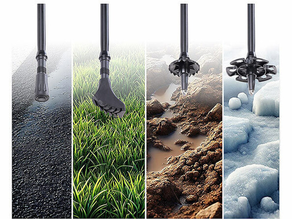 - Accessoires pour différents sols : tampons en caoutchouc pour une bonne adhérence sur les sols asphaltés et caillouteux, protection contre l'enfoncement pour une bonne adhérence sur les sols mous, la glace et la neige