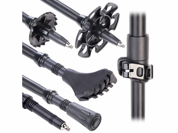 - Bâtons de trekking avec 2 embouts pour marche nordique, 2 embouts pour asphalte, 2 rondelles pour boue, 2 rondelles pour neige, 2 clips de fixation, sac de transport et mode d’emploi en français