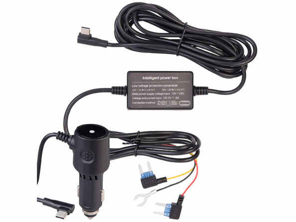 - Caméra embarquée UHD 4K, câble allume-cigare 12 V vers USB-C, câble d'alimentation, mode d'emploi en français