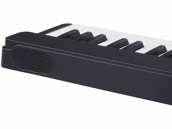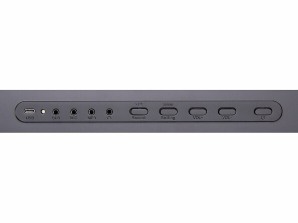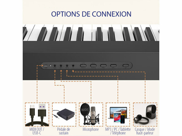 - Connectique : USB-C (chargement/connexion MIDI à un ordinateur, un smartphone ou une tablette), pédale de sustain, sortie audio jack 3,5 mm (pour casque ou haut-parleurs externes), entrée microphone (jack 3,5 mm), connexion MP3 (jack 3,5 mm)