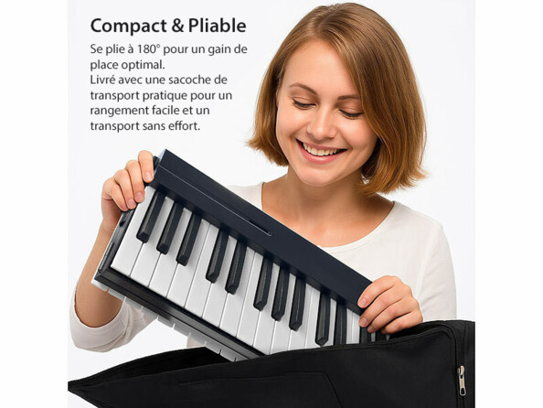 Grâce à son design innovant, le synthé se plie pour économiser de la place. Rangez-le ensuite dans son étui de transport solide. C'est parfait pour les cours de musique, les petits salons ou les séances improvisées en déplacement.