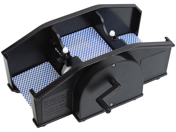 La machine est très simple à utiliser. Il vous suffit de placer vos cartes sur le plateau du mélangeur de cartes à jouer et de tourner la manivelle. Vos cartes tombent ensuite au hasard dans les deux bacs de récupération. Retirez alors les deux piles de cartes et commencez à jouer !
